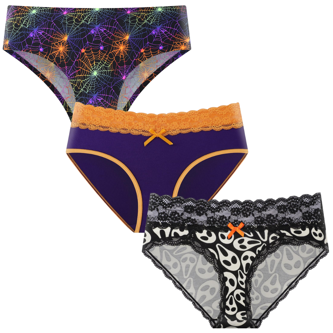 A festive mix of playful prints, bold colors, and delicate lace, this set is all about sweet Halloween vibes with a comfy, no-thong fit. Perfect for celebrating spooky season in style.