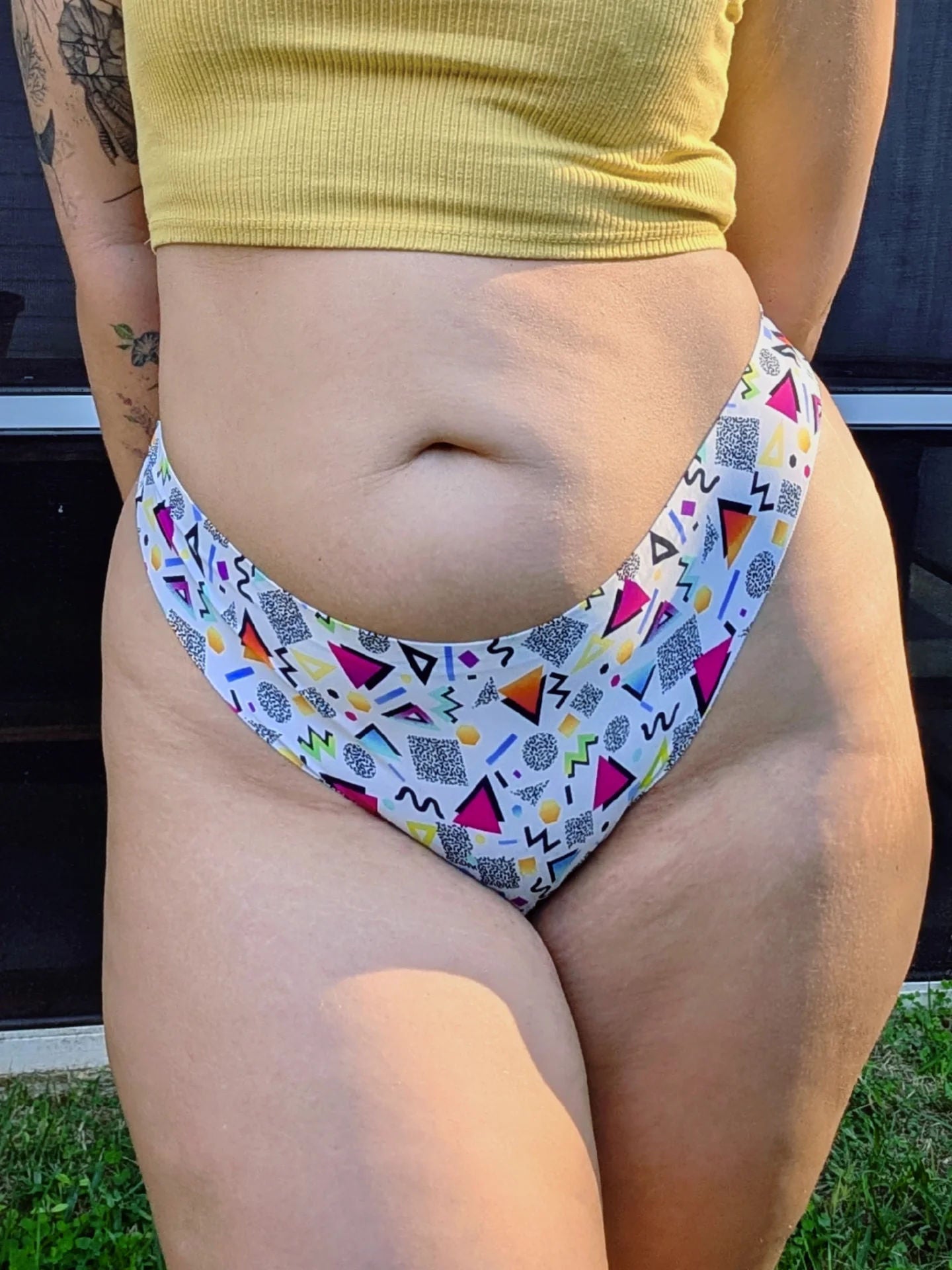 A fun trio of thongs in bold purple, neon 90s vibes, and playful geometric prints is sweet, comfy, and full of retro flair.