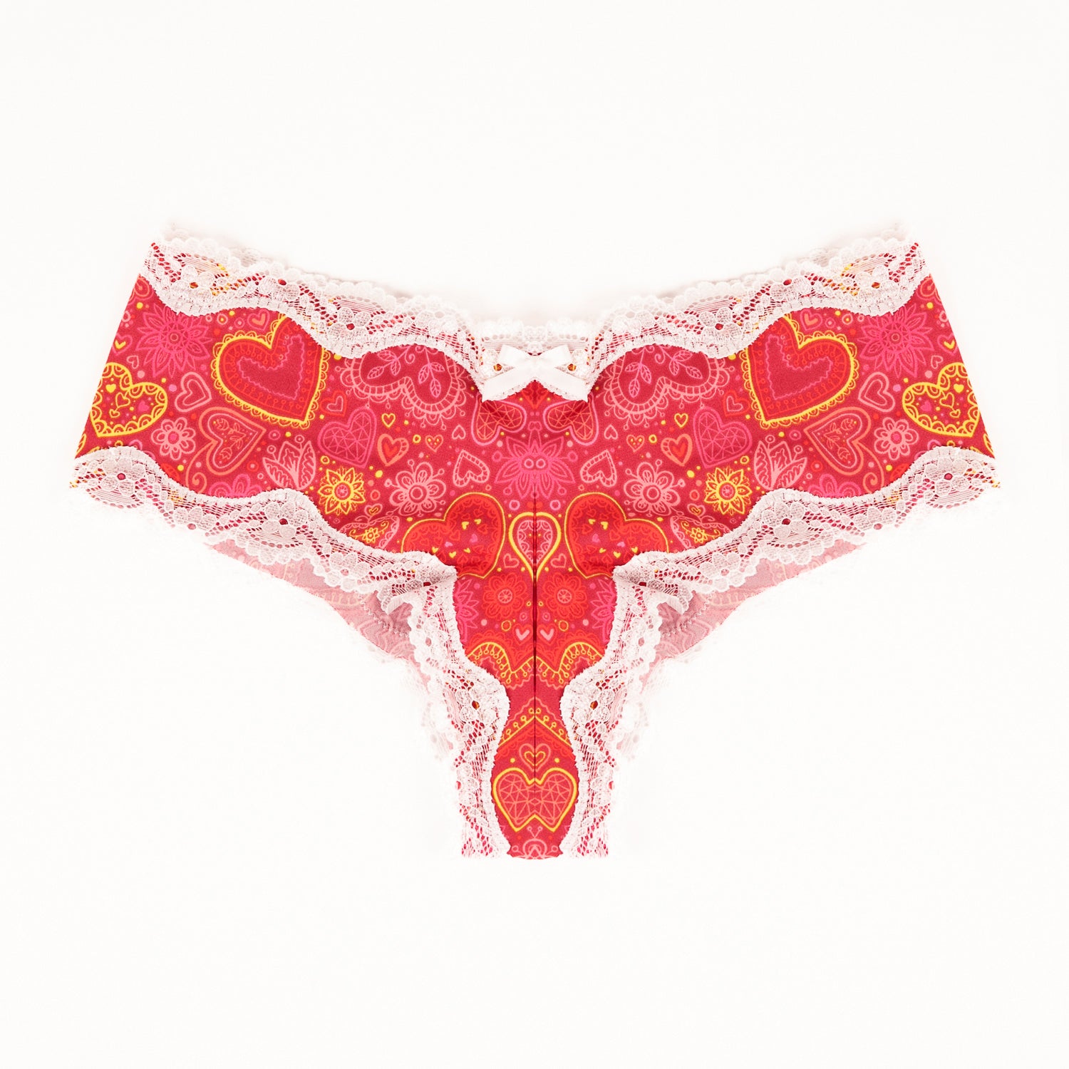 A multicolor heart cheeky. This cheeky was rated very comfortable by our members. A favorite for sure. Beautiful colors and classic white bow.