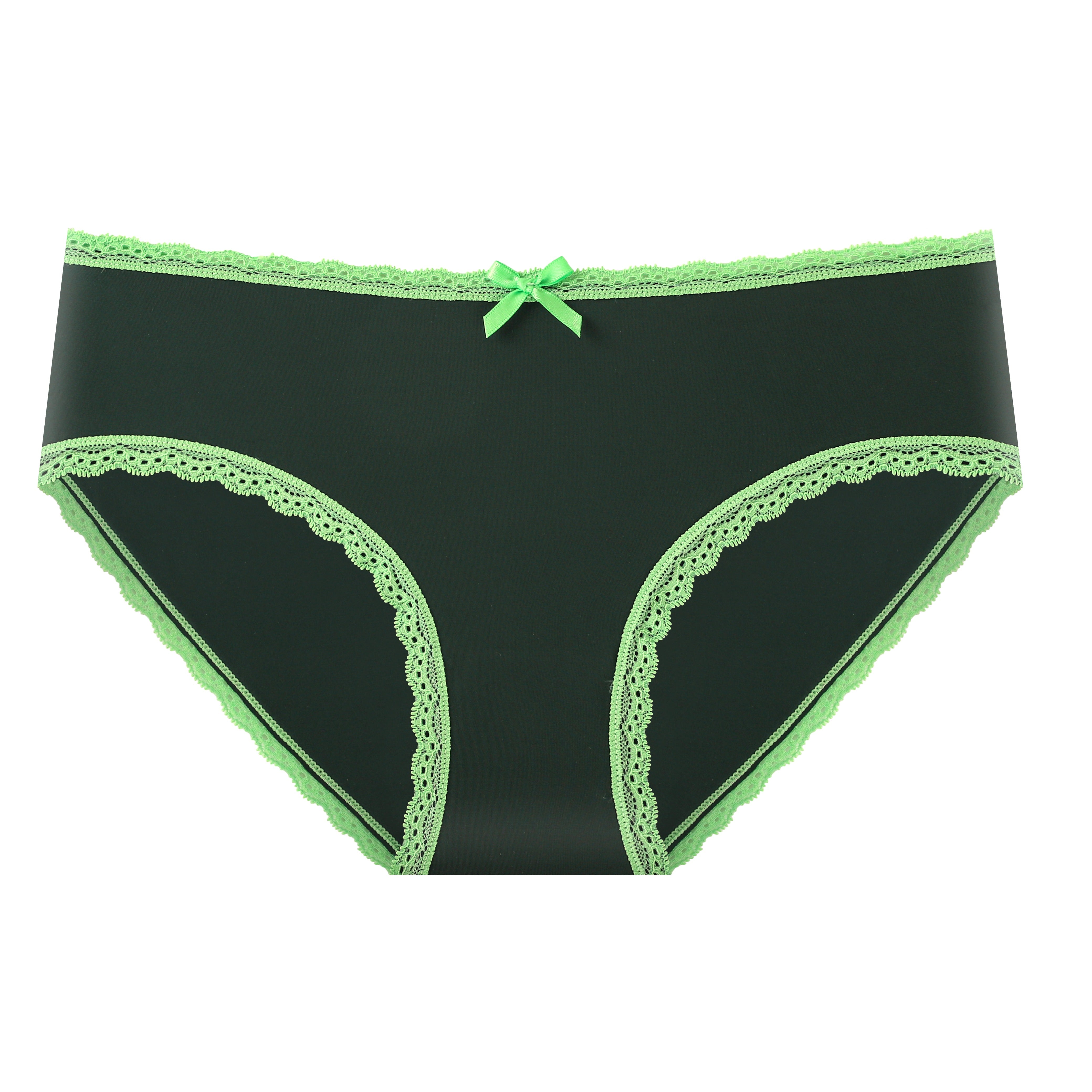 A smooth, comfy bikini in rich green with delicate lace trim and a sweet bow—cute, flattering, and perfect for everyday luck.